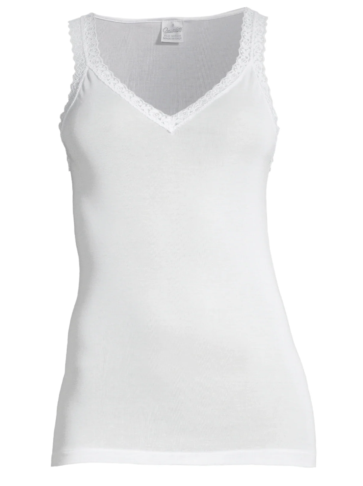 Made of the finest flat knit fabric in pure Egyptian Makò mercerized Cotton (Filoscozia®)with a gorgeous and feminine French leavers lace, certified and numbered as true “Dentelle de Calais®”,